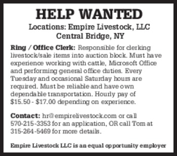MAYBROOK FARM, a high quality hay producing farm and distributor in Sprakers, NY (Montgomery County) is seeking a part-time or full-time farm worker that would assist with hay production until the end of the season and deliveries into the fall and throughout the year. Opportunities to move up in this lucrative operation are possible. To inquire/apply call John May at 518-365-6737.