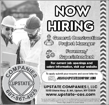 NOW HIRING GENERAL CONSTRUCTION Project Manager, Foreman/Superintendent. To apply submit your resume and cover letter to: joshv@upstatecompany.com. Upstate Companies I, LLC 1690 State Hwy. 8, Mt. Upton, NY 13809. www.upstate-cos.com.