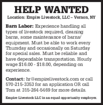 Wanted: Farm Labor for immediate opening, please call and inquire 518 231 8401