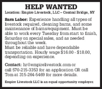 Wanted person to work on Dairy Farm; tractor and skid steer experience necessary, good wage and housing provided. If interested call 518-231-8401