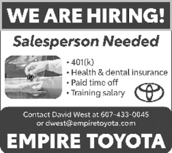 SALESPERSON NEEDED 401K HEALTH & dental insurance, paid time off, training salary. Contact David West at 607-433-0045 or dwest@empiretoyota.com. Empire Toyota in Oneonta.