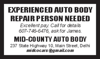 EXPERIENCED AUTO BODY REPAIR PERSON needed. Friendly and good working conditions with excellent pay, call or stop by for details 607-746-6476 or 607-435-0228, ask for Jim. 237 State Highway 10, Main Street, Delhi, NY.