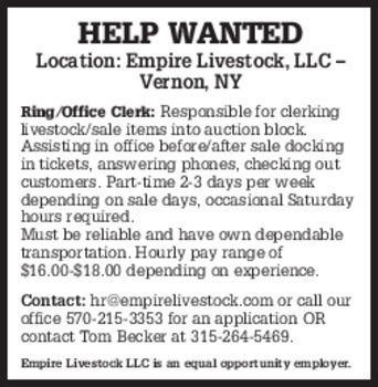 Wanted person to work on Dairy Farm; tractor and skid steer experience necessary, good wage and housing provided. If interested call 518-231-8401