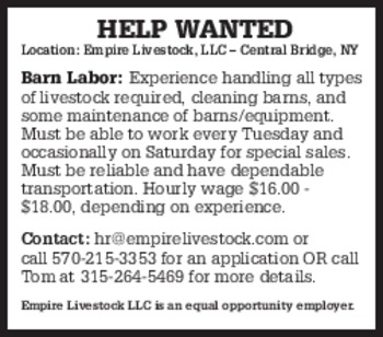 Wanted: Farm Labor for immediate opening, please call and inquire 518 231 8401