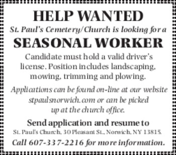 GENERAL CONTRACTOR looking to hire. Contruction Worker, General Laborer, Masonry Worker, Carpenter, Equipment Operator. CDL License a plus but not required. Experience helpful but also not required. Pay based on experience. Call 607-965-8413.