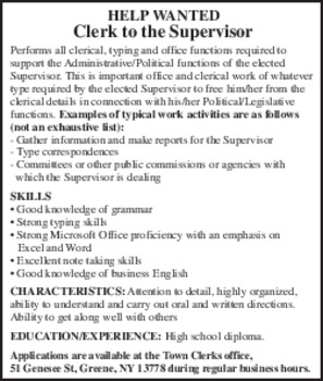 CLEANING PERSON female part time, 1 day a week. Salary open. Conesville, NY. 845-480-4697 or 914-426-2312.