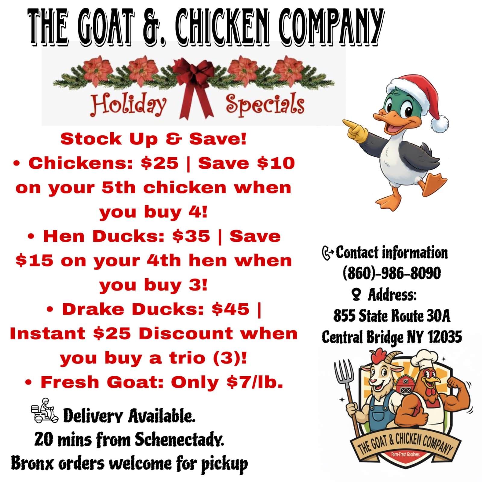 The Goat and Chicken Company "Farm Fresh Goodness" Stock Up & Save This Week for your Holiday! Chickens: $25 | Save $10 on your 5th chicken when you buy 4! Hen Ducks: $35 | Save $15 on your 4th hen when you buy 3! Drake Ducks: $45 | Instant $25 discount when you buy a trio (3)! Fresh Goat: Only $7/lb Delivery Available 20mins from Schenectady Bronx orders welcome for pick up Contact info: 860-986-8090 Address: 855 State Route 30A Central Bridge NY 12035